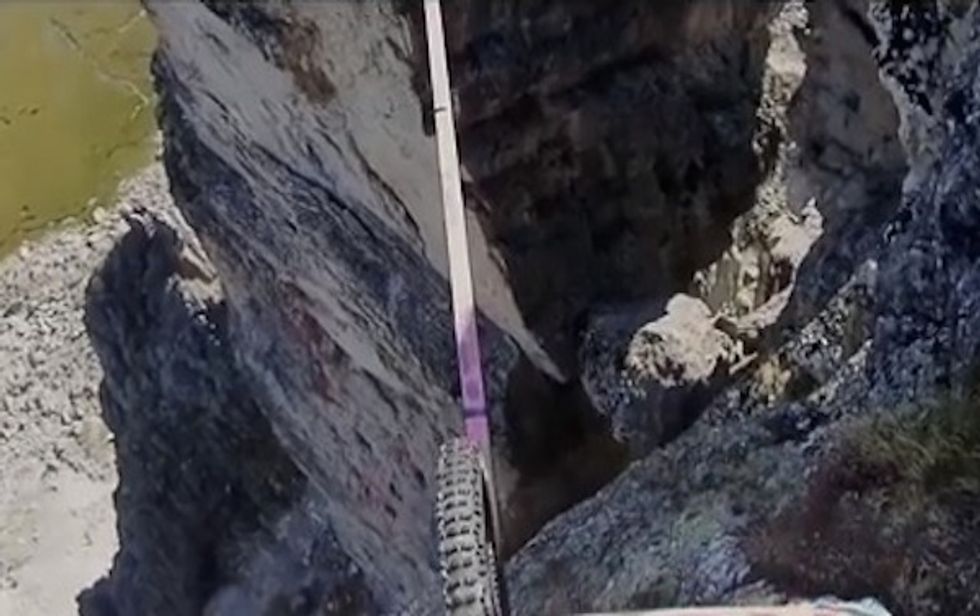Strung up in the French Alps, Belaey rode his bike over a nearly 60-foot-long slackline over a 367-foot drop.