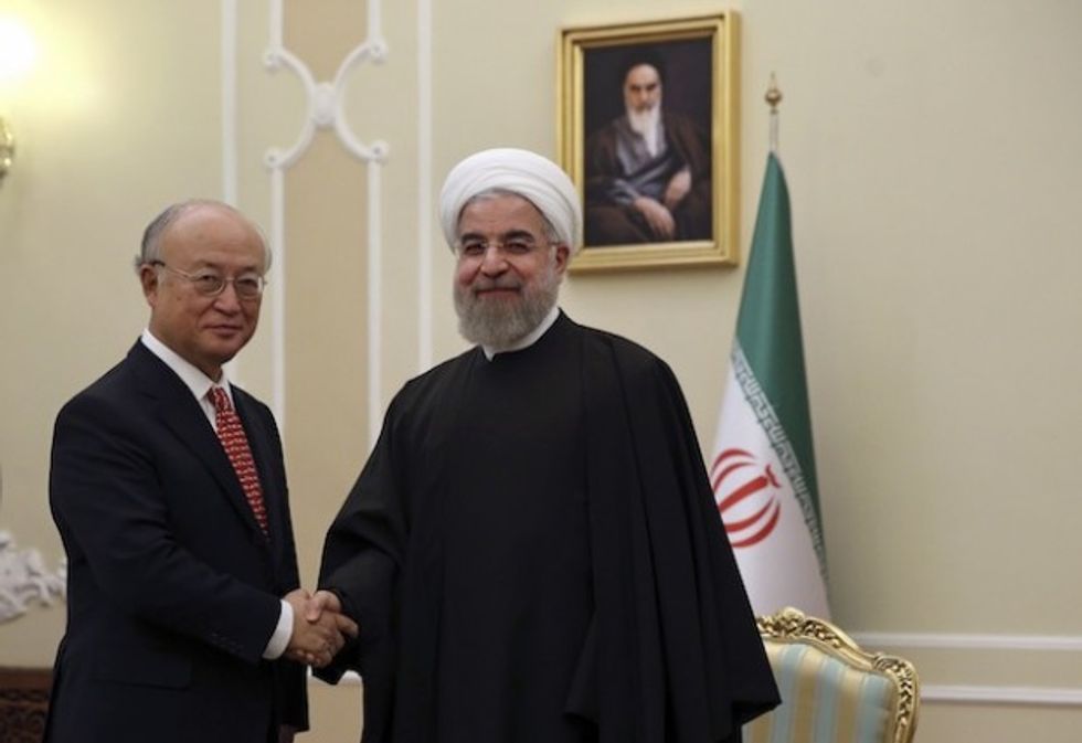 Iranian President Hassan Rouhani, center, welcomes U.N. nuclear chief Yukiya Amano at the start of their meeting in Tehran, Iran, Sunday, Sept. 20, 2015. (AP Photo/Vahid Salemi)