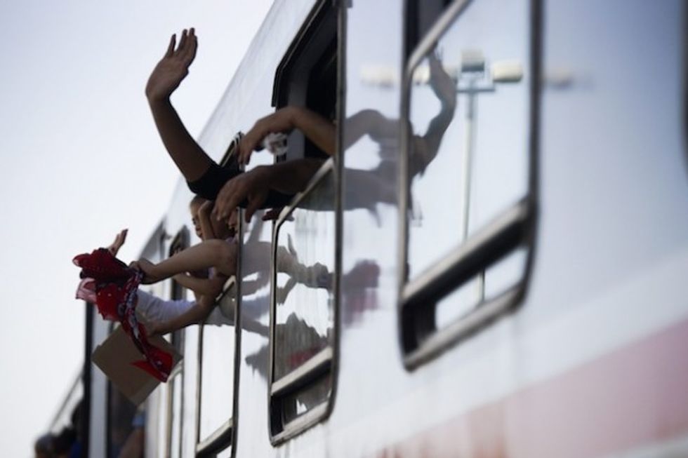 Migrants are seen on a train bound for Hungary at the railway station in Beli Manastir, Croatia, Friday, Sept. 18, 2015. (Zoltan Balogh/MTI via AP)