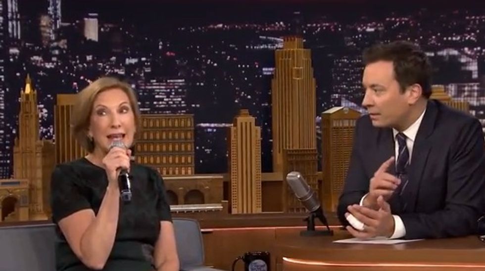 Republican presidential contender Carly Fiorina appeared on "The Tonight Show Starring Jimmy Fallon" Monday evening, where she predictably talked straight-faced politics, including making some comments about fellow White House hopeful Donald Trump, among other political issues.
