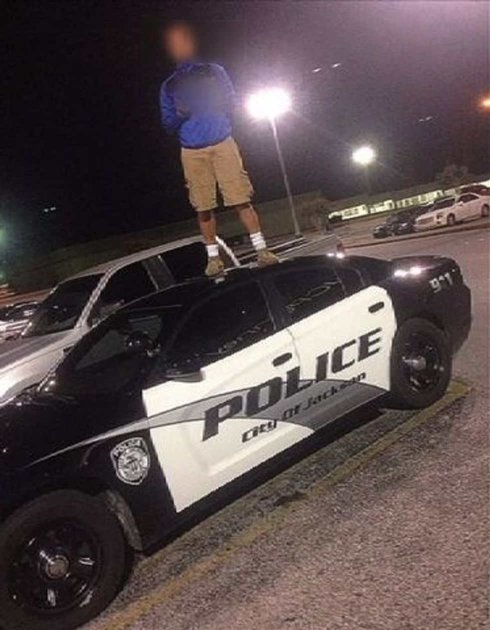 Police in Jackson, Tennessee, said pictures of the teenager standing up on the car were circulating around social media, and because of help from the suspect's family, they were able find out who it was, WHBQ-TV reported.
