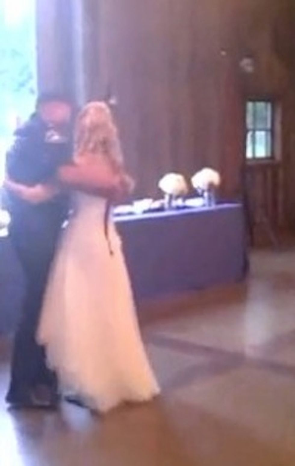 "We're sitting there dancing," the Spanaway, Washington, woman, dancing with Pierce County Sheriff's Detective Don Jones who walked her down the aisle, told the news station, "and then all of a sudden someone taps me on the shoulder and says, 'Can I cut in?' and I was shocked. I didn't know how to react, how to respond.