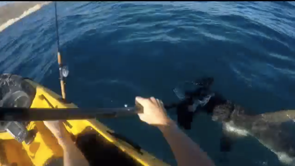 Mark McCracken, 33, was fishing off the coast of Santa Barbara, California, Saturday when the shark first came up to him. For approximately 15 minutes, the shark circled McCracken's kayak as the fisherman used his paddle to hit the shark in an attempt to prevent it from ramming into his boat.
