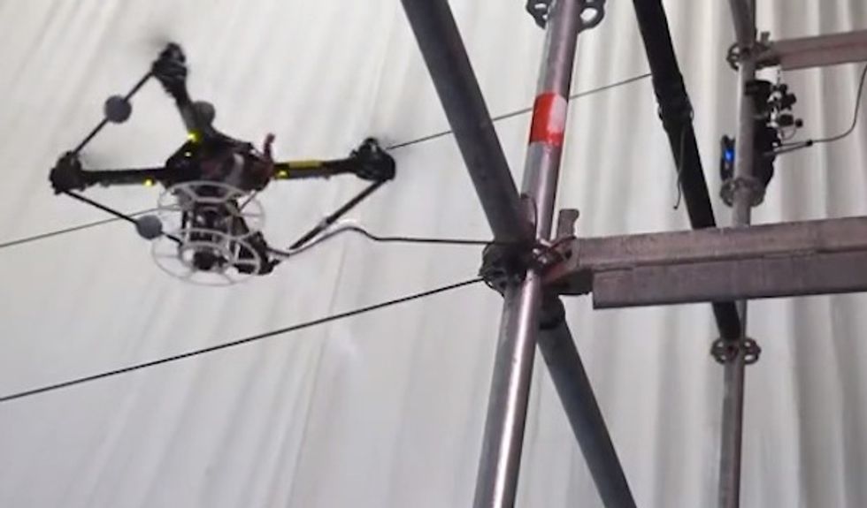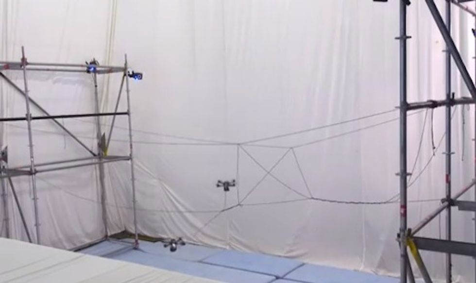 "The vehicles are equipped with a motorized spool that allows them to control the tension acting on the rope during deployment," the researchers explained in the video description. "A plastic tube guides the rope to the release point located between two propellers. The external forces and torques exerted on the quadrocopter by the rope during deployment are estimated and taken into account to achieve compliant flight behavior. The assembly of the bridge is performed by small custom quadrocopters and builds upon the Flying Machine Arena, a research and demonstration platform for aerial robotics. The arena is equipped with a motion capture system that provides vehicle position and attitude measurements. Algorithms are run on a computer and commands are then sent to the flying machines via a customized wireless infrastructure."