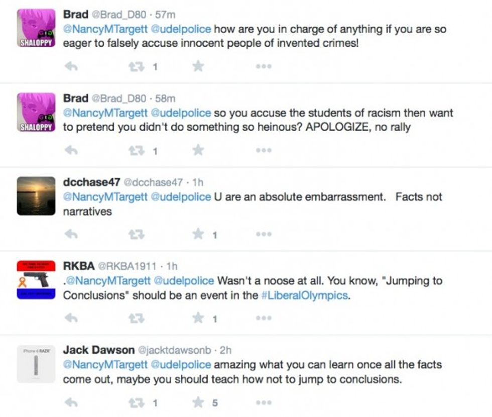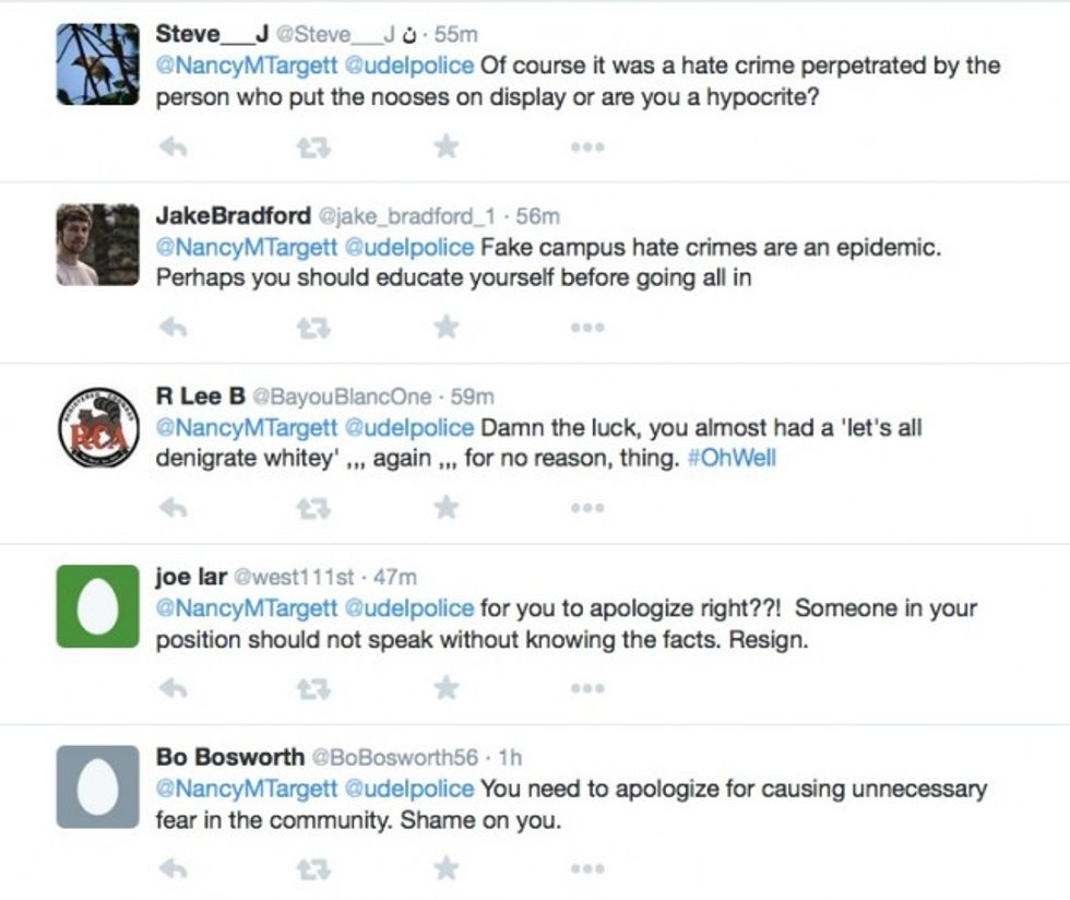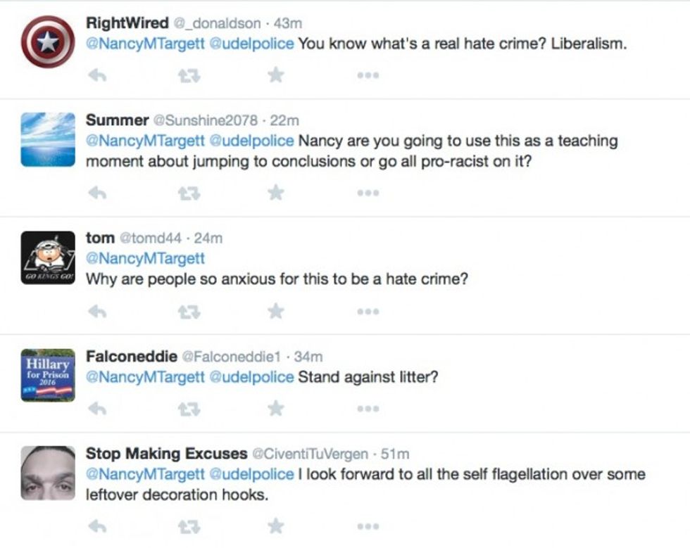 — Nancy Targett (@NancyMTargett) September 23, 2015She went further on the UD Facebook page, saying: “We are both saddened and disturbed that this deplorable act has taken place on our campus. This hateful display stands in stark contrast to Monday night's peaceful protest and discussion. We condemn this despicable action and ask everyone in our community to stand together against intolerance and hate."