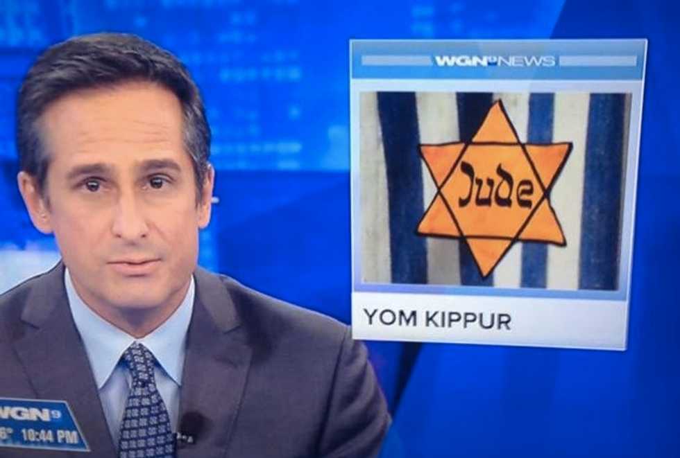 During a brief segment Tuesday night noting the beginning of Yom Kippur, the holiest day of the Jewish calendar, Chicago news station WGN-TV used an image of a yellow Jewish star with the word "Jude" in the middle — the badge the Nazis forced Jews to wear during the Holocaust.