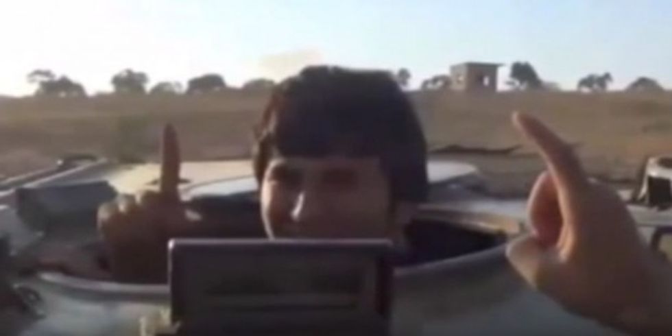 He is encouraged by his comrades-in-arms to lift his index finger, a salute associated with jihadist groups that expresses the oneness of Allah.