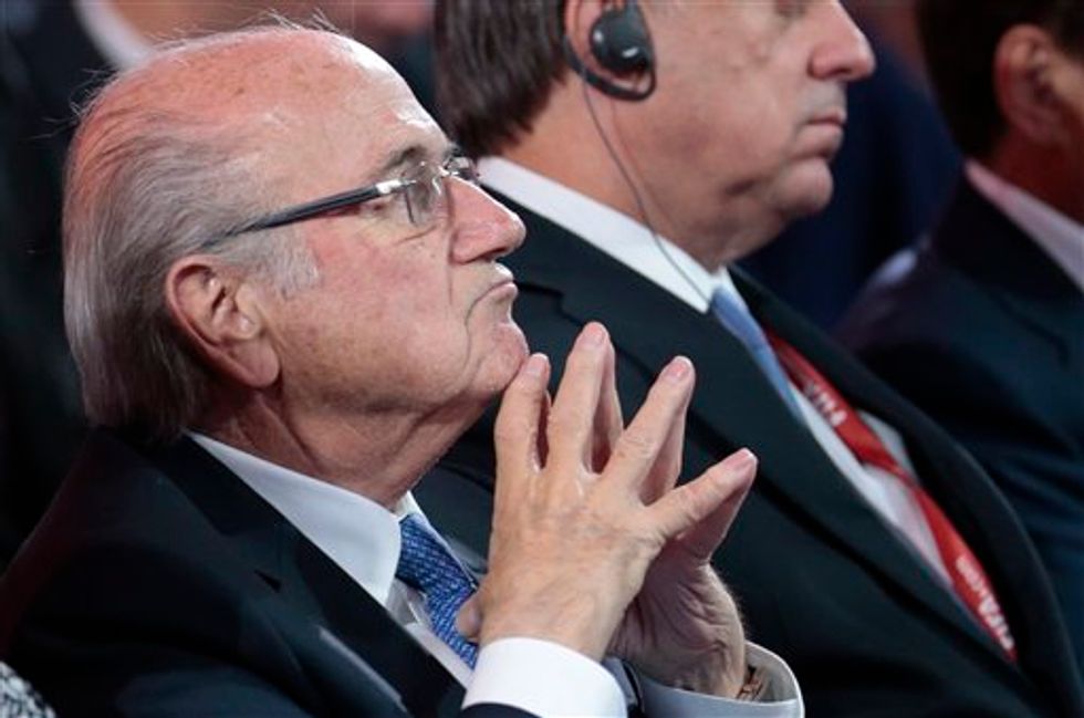 FIFA President Sepp Blatter watches the preliminary draw for the 2018 soccer World Cup in Konstantin Palace in St. Petersburg, Russia, Saturday, July 25, 2015. (AP Photo/Ivan Sekretarev
