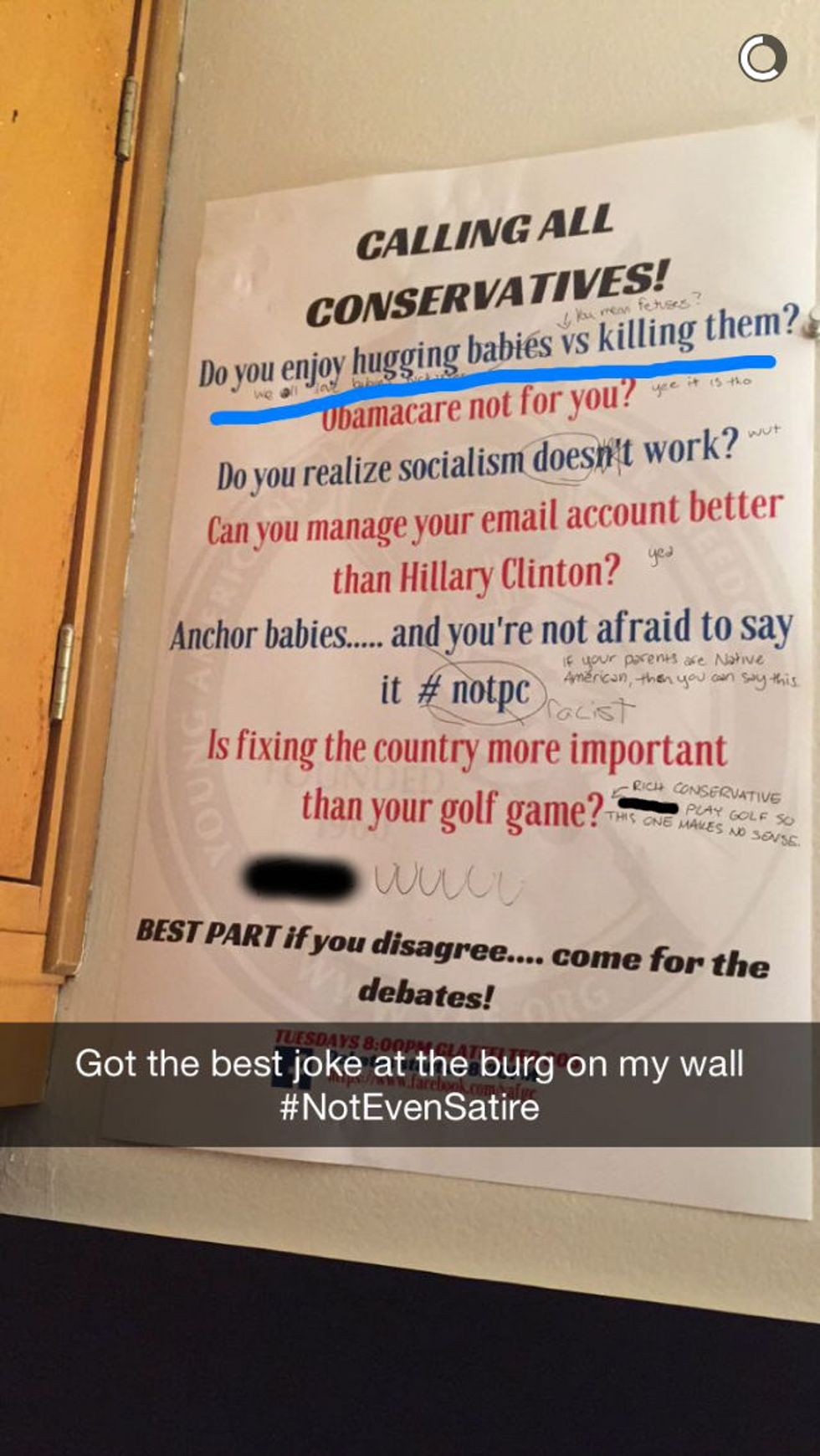 "'Calling all Conservatives,' it read, and the first line said 'do you enjoy hugging babies versus killing them?' The rest went on to spew more ultra-conservative propaganda, none of which bothered me nearly as much as that first line," the student wrote. "The truth is, whoever took the time to write those hateful words and then spread them all around campus didn’t have to say the word abortion for me to know what they meant. Abortions kill babies. Women who undergo abortions are baby killers."