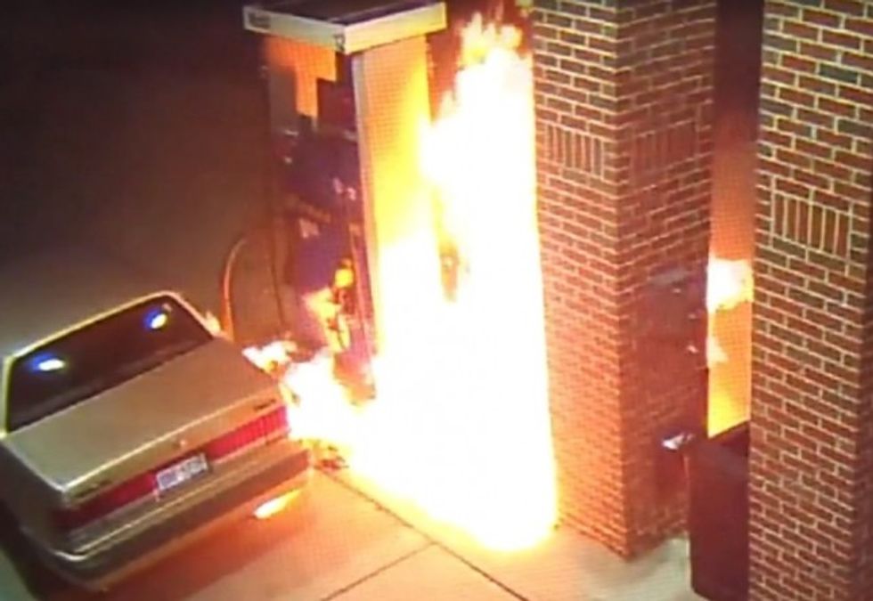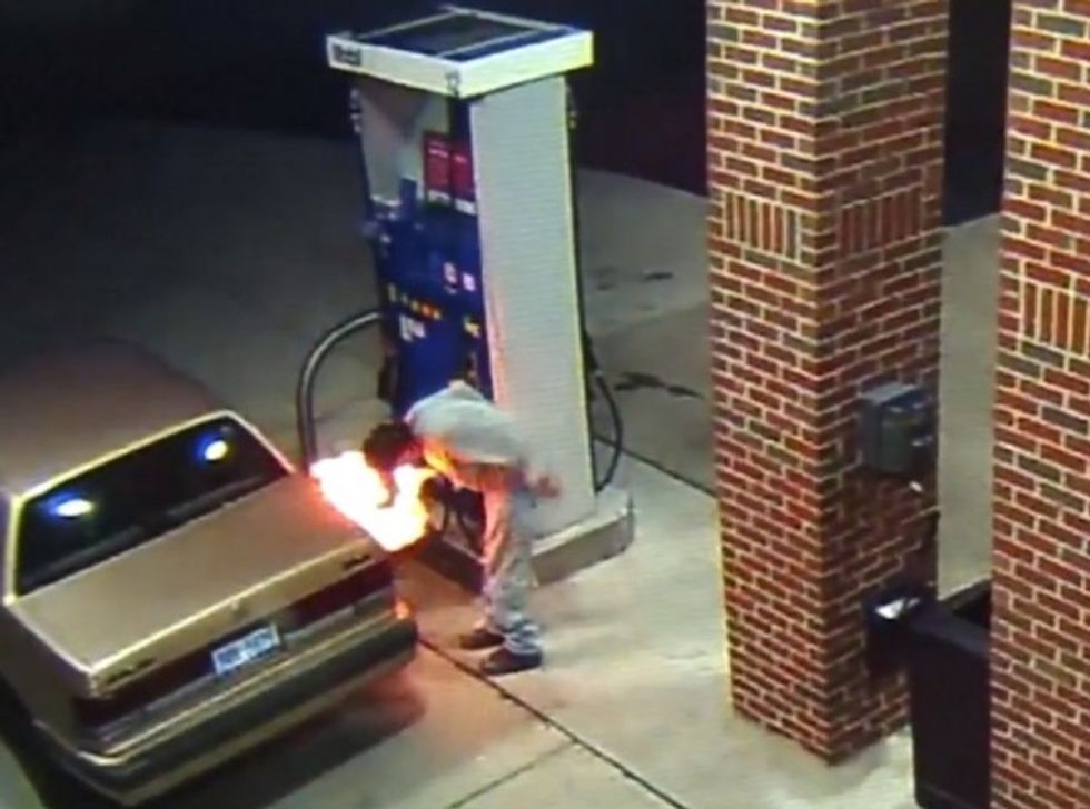 As soon as he ignited the lighter, flames shot from his gas tank and then engulfed the pump in seconds.