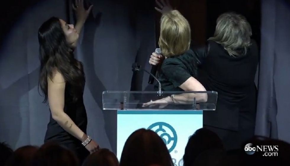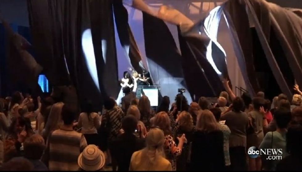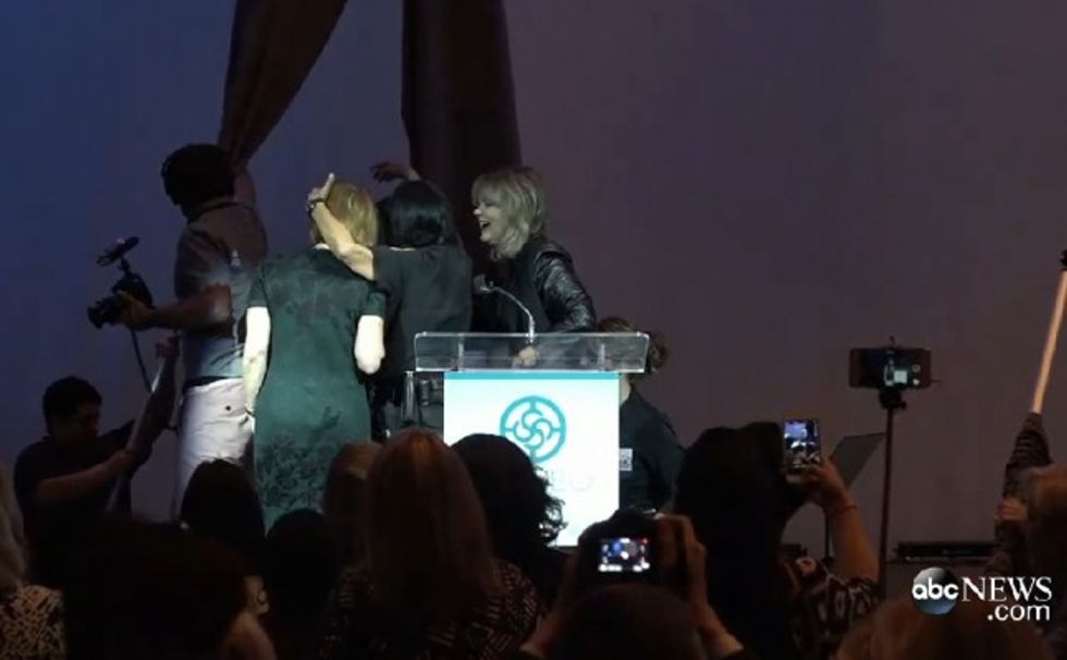 Two women onstage with Fiorina drew close to her, protecting her with their arms and hands as the curtains rumbled and fell; a security officer was seen in the video coming up to the stage to protect Fiorina as well.