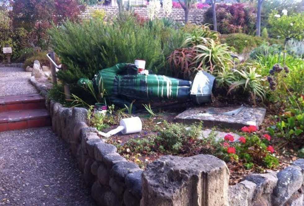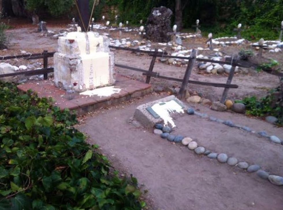 Carmel Police Sgt. Luke Powell tells the Salinas Californian that vandals struck Saturday night, damaging statues, gravesites and signs and spewing green and white paint on doors.