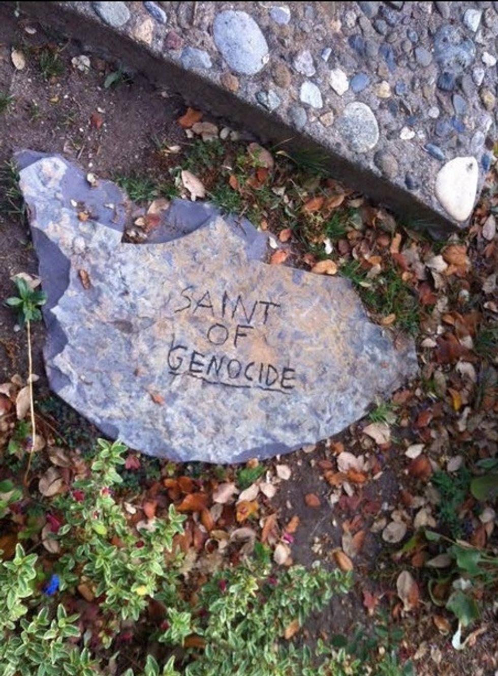 Photos posted on the Mission's Facebook page show someone wrote "Saint of Genocide" on a stone.