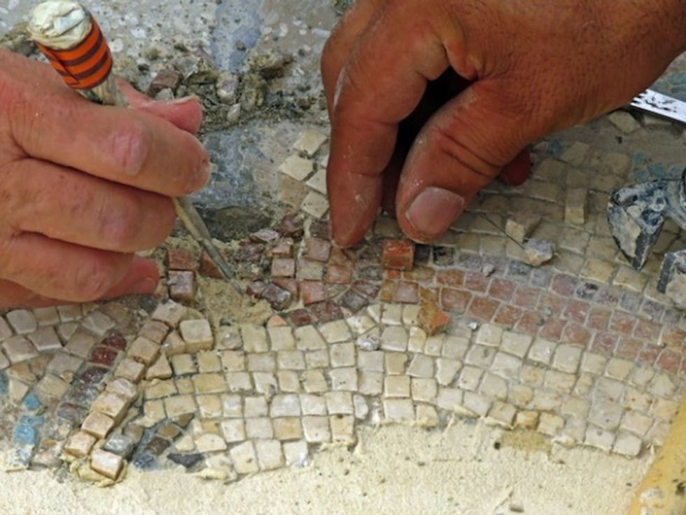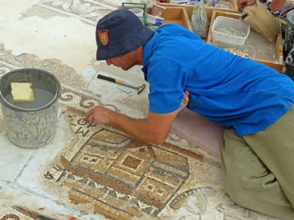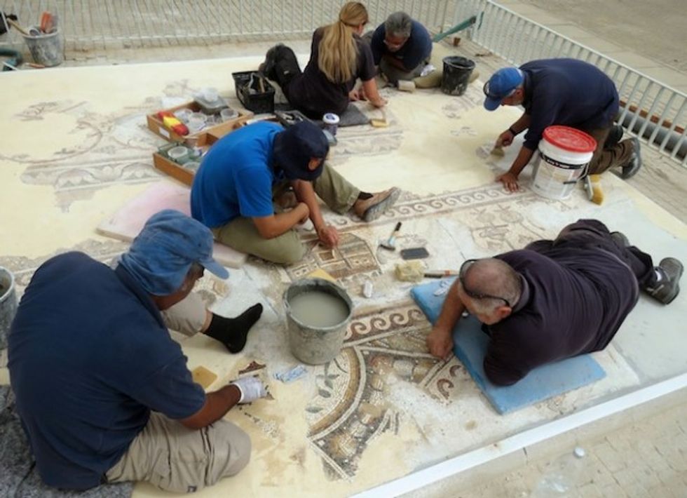 Israel Antiquities Authority workers carry out detailed conservation work on the ancient church mosaic.  (Photo: Israel Antiquities Authority/Nikki Davidov)