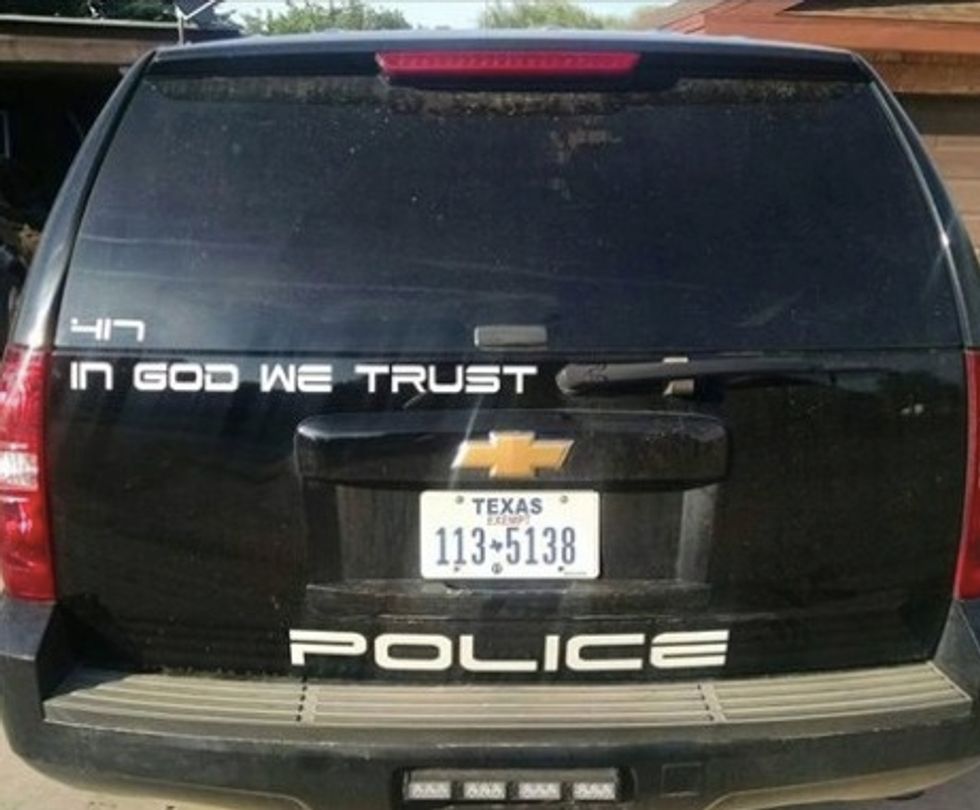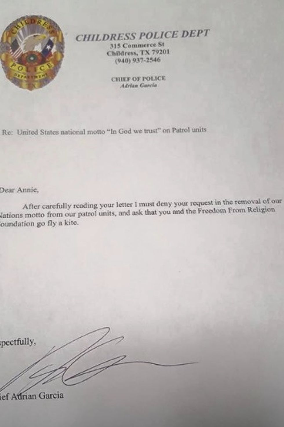 Adrian Garcia, head of the Childress Police Department in Childress, Texas, apparently wasn't willing to entertain demands that the nation's motto — which secular critics claim is an unconstitutional violation of the separation of church and state — be removed from vehicles.