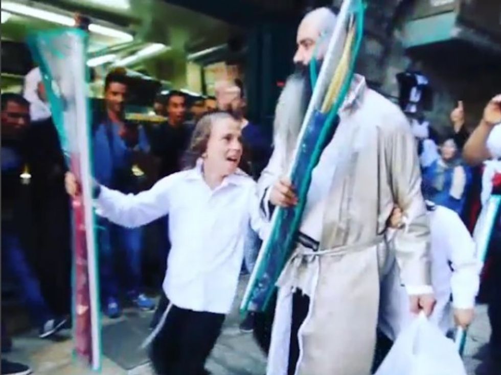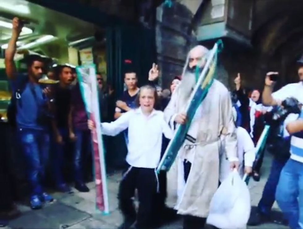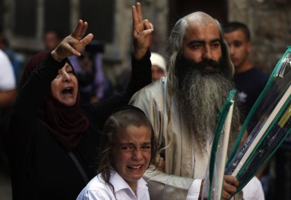 Boy cries as the mob harasses him, his father and brother as they walk through the Muslim Quarter of the Old City after praying at Jerusalem's Western Wall for the Jewish holiday of Sukkot. (Image source: Facebook/0404)