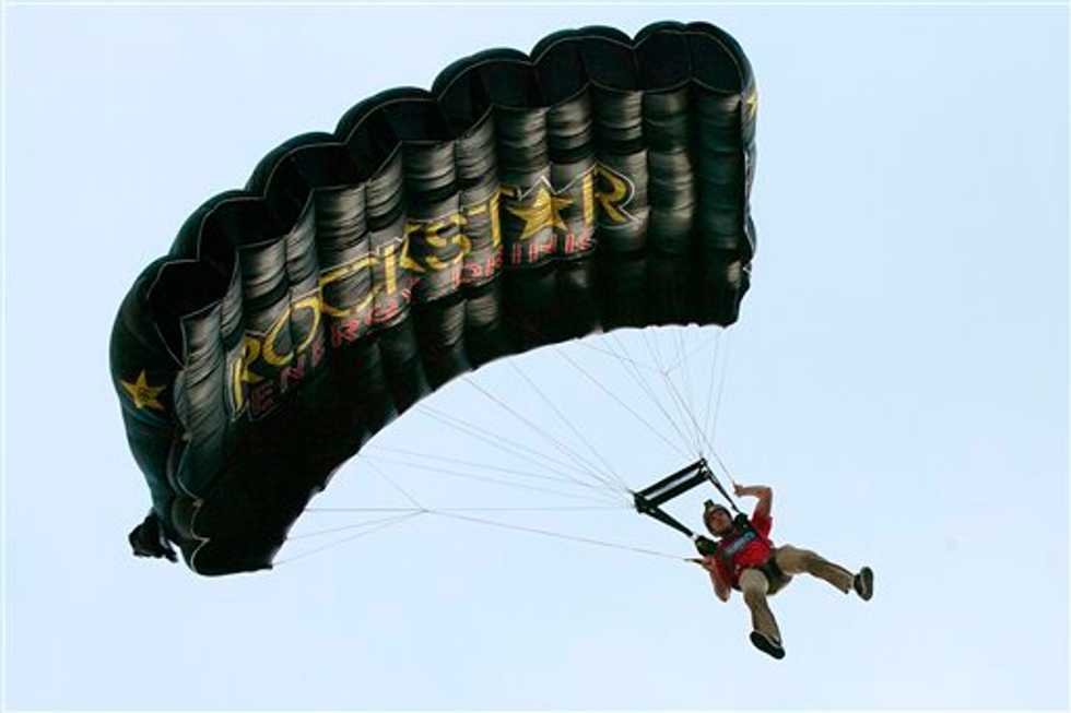 Erik Roner of Nitro Circus is seen base jumping off The Signature at the MGM Grand Hotel & Casino on Wednesday June 1, 2011 in Las Vegas to promote the North American debut of Nitro Circus Live at the MGM Grand Garden Arena on Saturday June 4, 2011. (Jeff Bottari/AP Images for Nitro Circus Live)