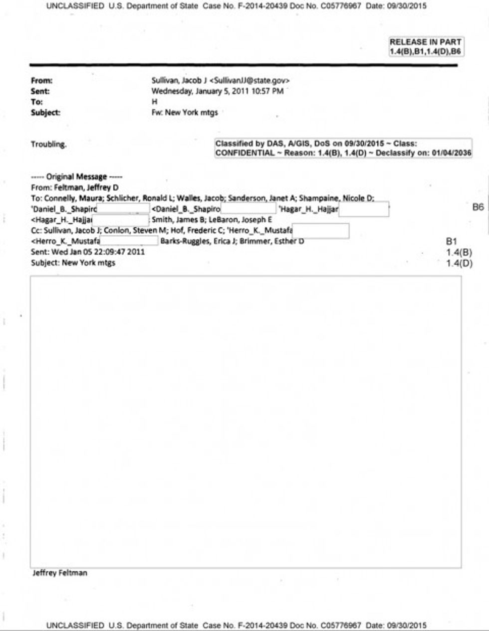 The email was almost entirely redacted because it contained classified information, but an aide to the former secretary of state described it as "troubling" in an email to her.