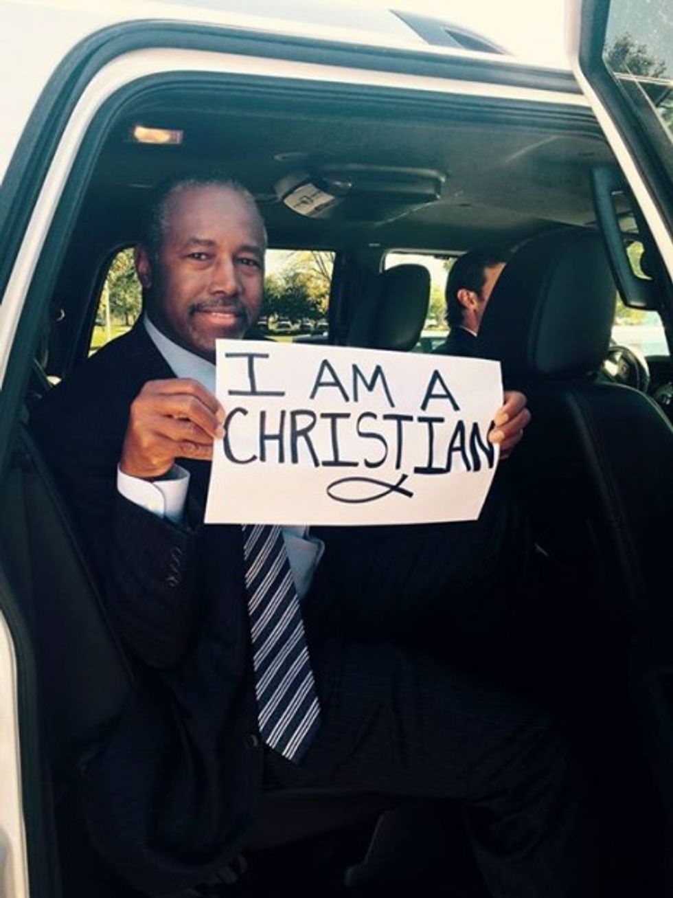 Presidential candidate Ben Carson posted a photo Friday to Facebook that shows him holding a sign with a simple, four-word message: "I am a Christian."