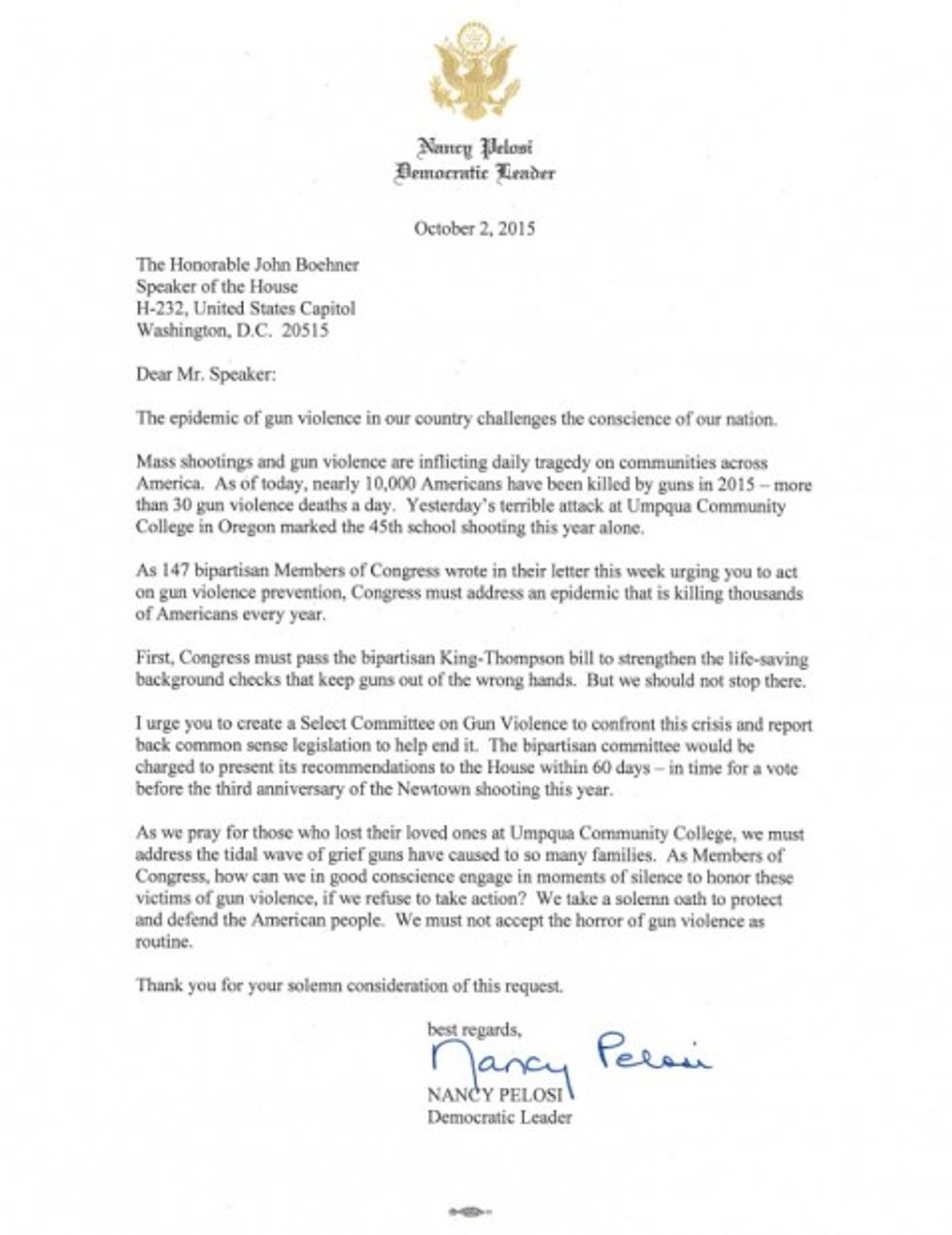 "Mass shootings and gun violence are inflicting daily tragedy on communities across America," Pelosi wrote to the outgoing speaker. "As of today, nearly 10,000 Americans have been killed by guns in 2015 – more than 30 gun violence deaths a day. Yesterday’s terrible attack at Umpqua Community College in Oregon marked the 45th school shooting this year alone."
