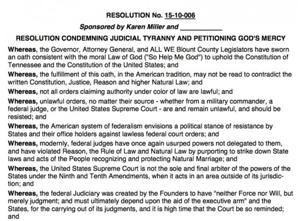 The resolution, which takes aim at the federal legalization of gay nuptials, was purportedly written by Blount County Commissioner Karen Miller and will be considered at a county meeting on Tuesday evening, the Huffington Post reported.