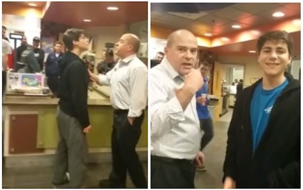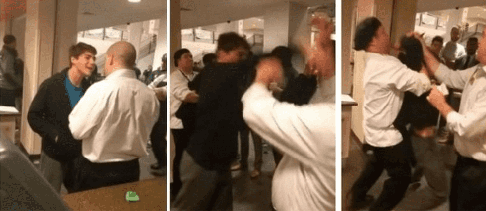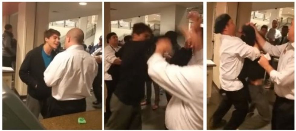 The, the student made the even bigger mistake of pushing the manager. Someone quickly jumped in between Gatti and the manager. Gatti tried to wrestle this other student and that's when a female cook got involved, strongly ordering him outside.