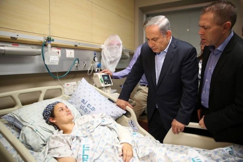 Prime Minister Benjamin Netanyahu visits stabbing attack survivor Adele Banita, whose husband Aharon and another Israeli man were killed by a Palestinian terrorist in Jerusalem Saturday night (Photo: Kobi Gideon/Israeli GPO)