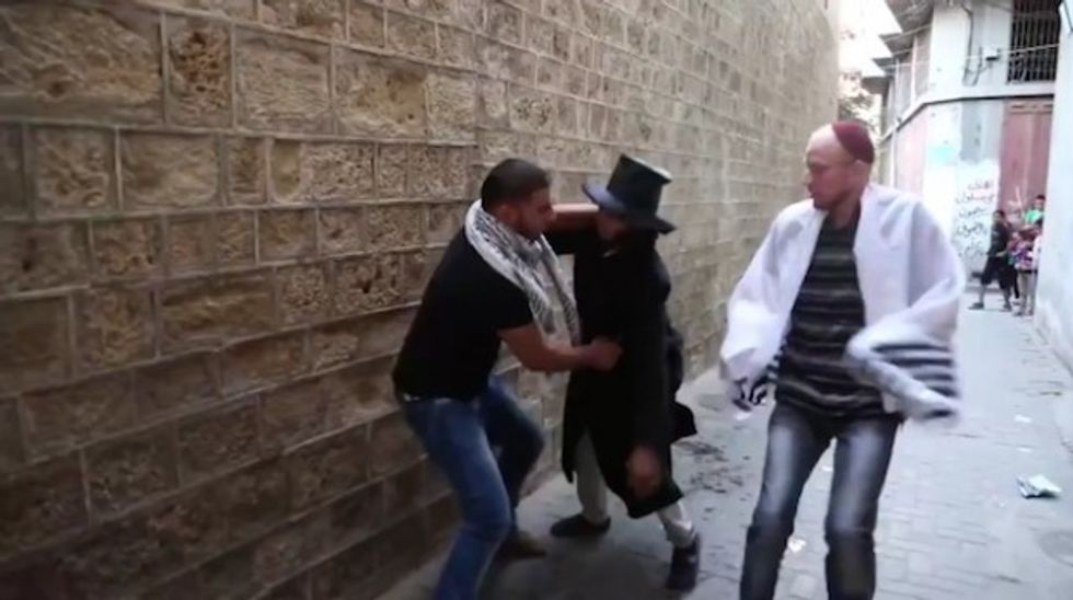 In the video, the Jewish characters, dressed in stereotypically religious clothes, are portrayed as bullies, knocking over Palestinian boys playing in an alley that bears an uncanny resemblance to the alleys of Jerusalem’s Old City. The actions of the "Jews" in the video upset a nearby Arab man wearing a keffiyeh scarf around his neck, who then brandishes a knife and waits surreptitiously for the evil caricatures to walk past.
