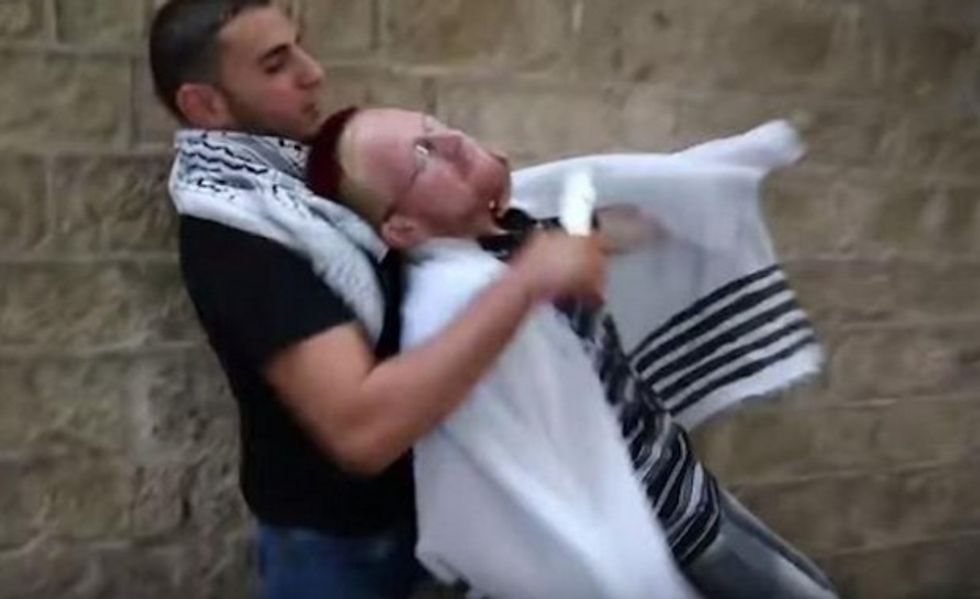 The Arab man stabs one man in the heart and then chases the other. Once he catches up to the second "Jew," he slashes the man's throat.