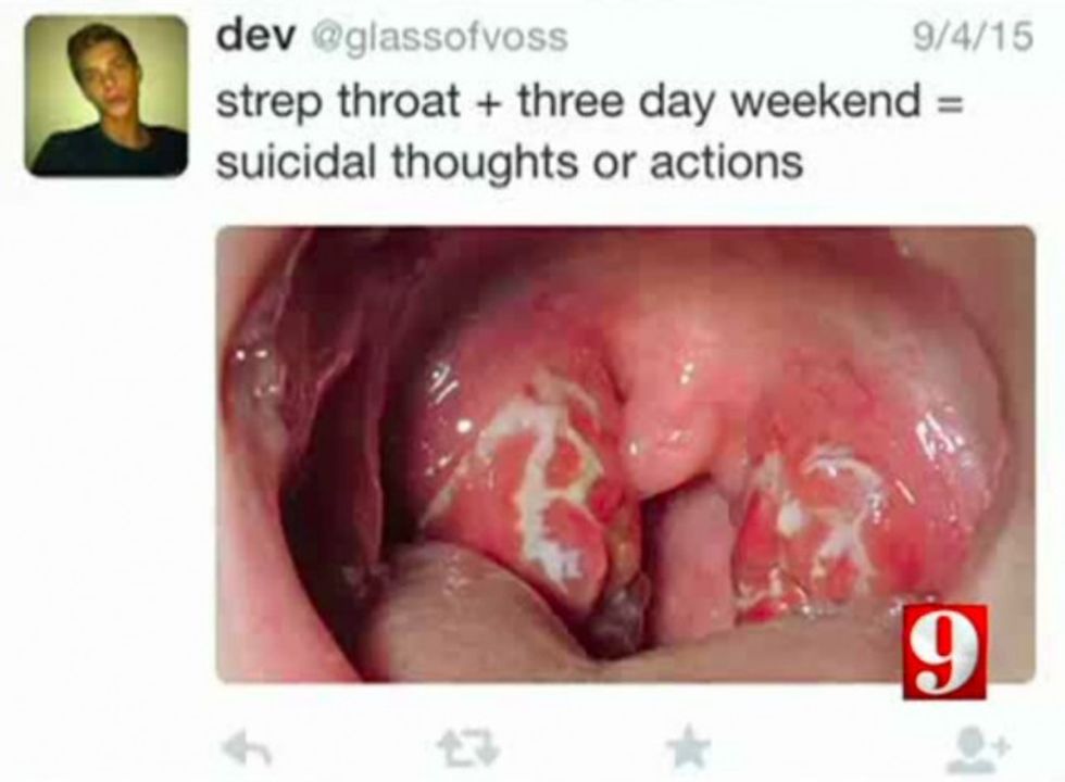 While investigators said Foster deleted the tweet after a minute, he followed it up with a photo of the inside of a mouth, declaring "strep throat + three day weekend = suicidal thoughts or actions."