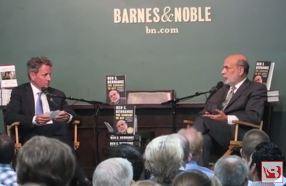 Bernanke and Geithner appeared together at the book signing at the flagship Barnes & Noble in New York City's Union Square Tuesday night to promote Bernanke's new memoir, “The Courage to Act: A Memoir of a Crisis and Its Aftermath.”