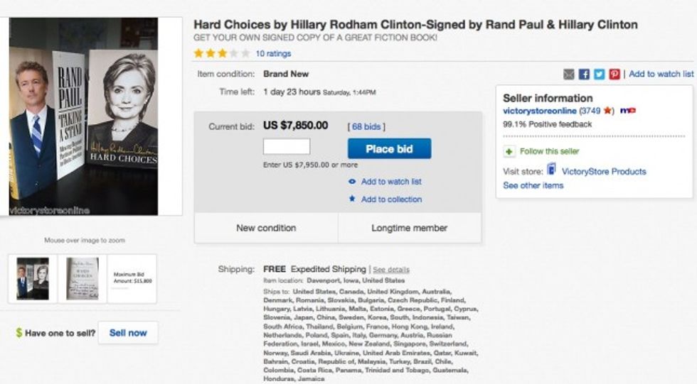 Sen. Rand Paul's auction of Hillary Clinton's book "Hard Choices" — which he billed as "a great fiction book" on his campaign website and signed with a biting note to the Democratic presidential candidate — was up to nearly $8,000 on eBay Thursday afternoon.