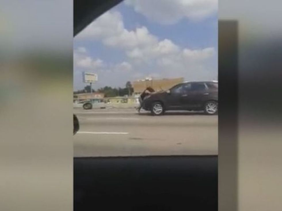 That's when the woman jumped on the hood and grabbed the windshield wipers, but the suspect fled with the victim still hanging on, according to police. The ex-girlfriend fell off a short distance away along a service road off Interstate 45 in southeast Houston.