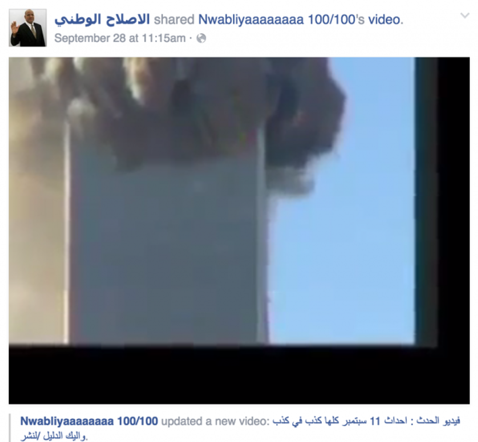 “There’s also an Arabic Facebook page for the National Reform Party, a political party started by Elhassan Mohamed, bearing a similar profile picture and address,” Gallagher explained. “Only, this webpage is much more active and the tone is very different, including a 14-minute conspiracy theory clip on the 9/11 terrorist attacks and a post that shows the smoking World Trade towers, describing as a U.S.-sponsored hoax to launch a world war against Islam and Muslims.”