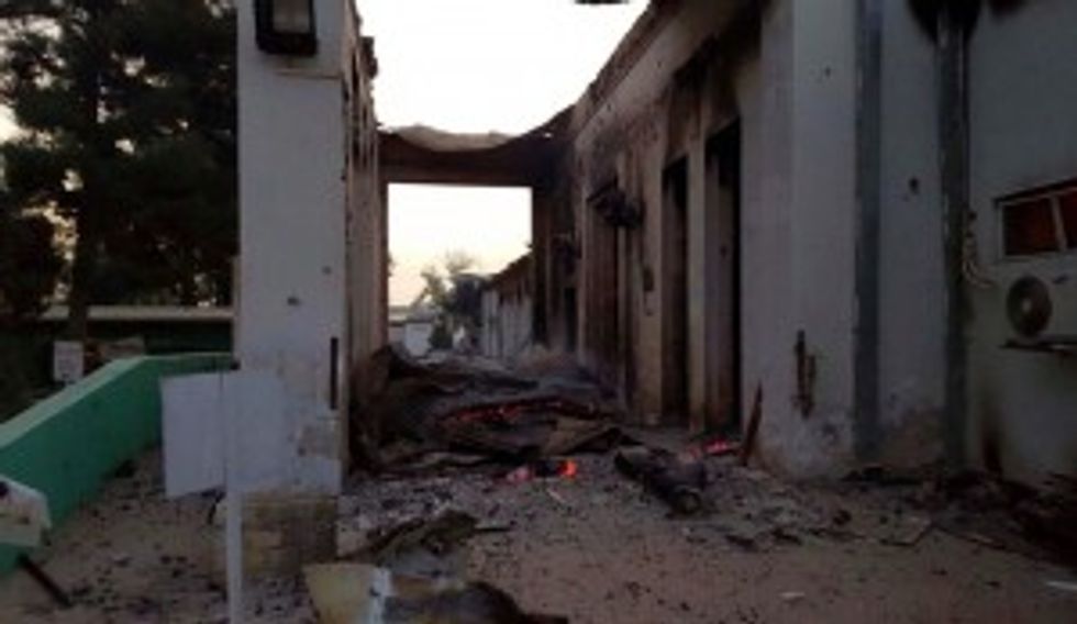 The burned Doctors Without Borders hospital is seen after explosions in the northern Afghan city of Kunduz, Saturday, Oct. 3, 2015. (Image source: Médecins Sans Frontières via AP)\n
