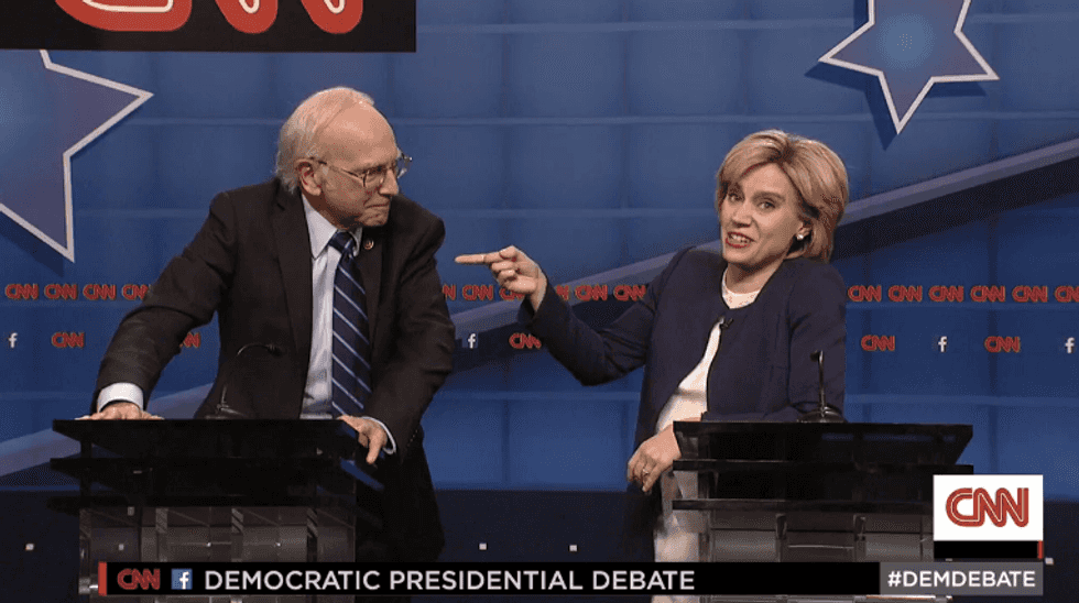 The man behind "Seinfeld" and "Curb Your Enthusiasm" was joined on stage by "SNL" regular Alec Baldwin who played a grumbling former Virginia Sen. Jim Webb. The hilarious sketch mocked last week's CNN debate and joked of a camaraderie between David as Sanders and comedian Kate McKinnon as Hillary Clinton — who made several references to her ever-changing demeanor to become more likable as a candidate.