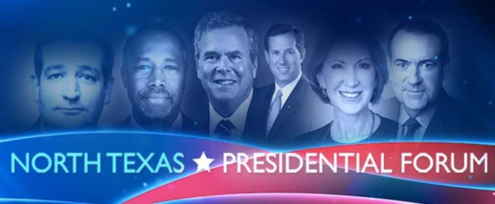 Republican presidential candidates Dr. Ben Carson, Carly Fiorina, Jeb Bush, Ted Cruz, Mike Huckabee and Rick Santorum are confirmed speakers at the 2015 North Texas Presidential Forum at Prestonwood Baptist Church in Plano, Texas. Co-sponsored by the Faith & Freedom Coalition, "participants address the audience for 10 minutes followed by a 10-minute center stage discussion with Dr. Jack Graham, pastor of the 40,000-member church, about the importance of faith in public life."
