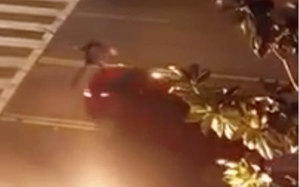 The man wielding the weapon is seen in the video getting struck by two different vehicles after walking into the street. One of the vehicles, a red car, is seen backing up toward the man as he appears to hit the car with the machete. A second vehicle, a white sedan, then plows into him sending him flying through the air and landing near an intersection.