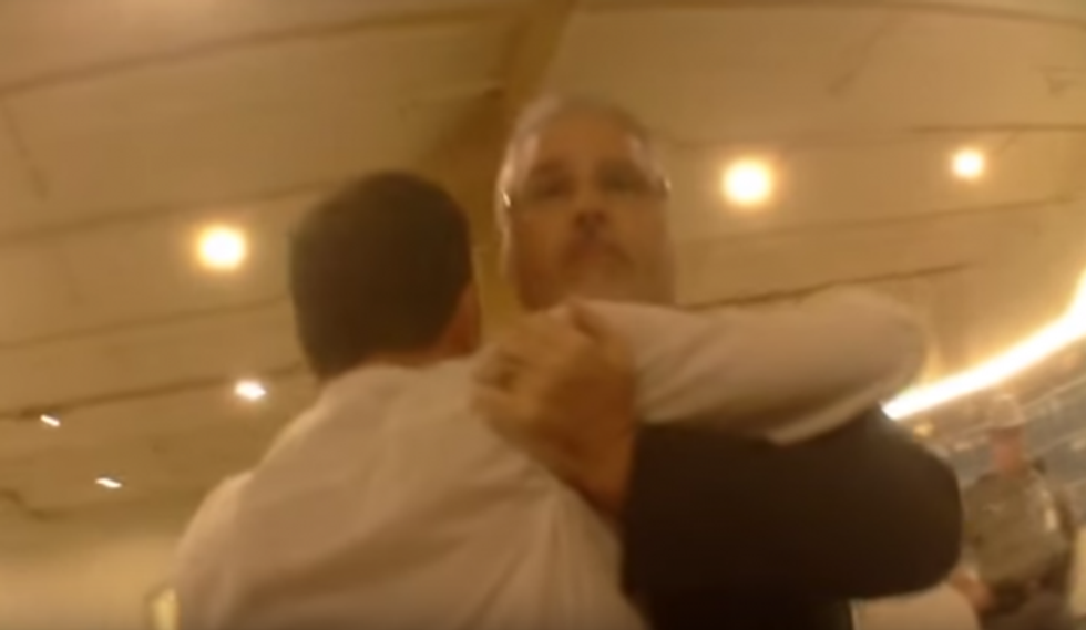 The staff members and security had to physically restrain Huberty who appeared to attempt to go after the reporter. Several times staff members said, "He's not worth it."