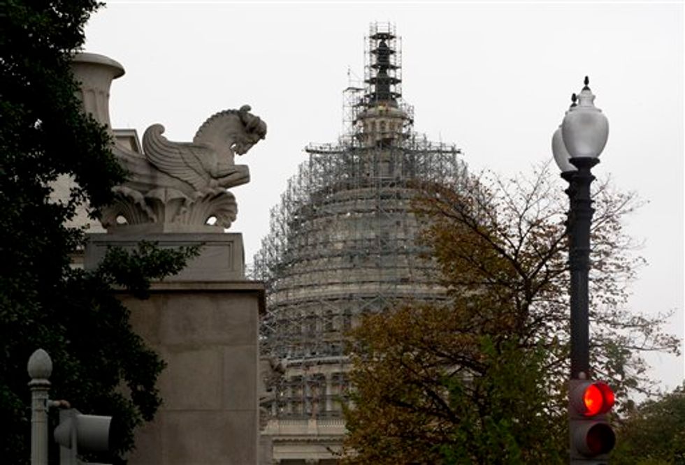 The Capitol Dome, covered with scaffolding is seen on Capitol Hill in Washington, Wednesday, Sept. 30, 2015. On Wednesday, the Senate easily approved a stopgap spending bill to avert government shutdown; House to follow. (AP Photo/Carolyn Kaster)
