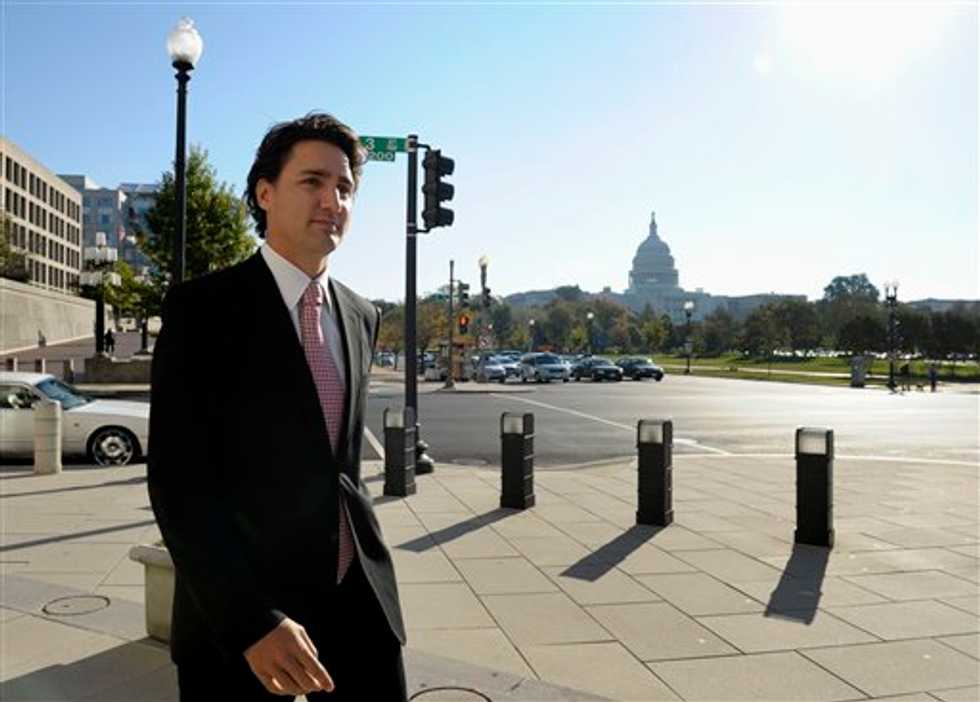 Newly elected Canadian Prime Minister Justin Trudeau arrives to speak to reporters during his first official visit to Washington since becoming Liberal Party Leader, Friday, Oct. 25, 2013, near Capitol Hill in Washington, D.C.(AP/Susan Walsh)