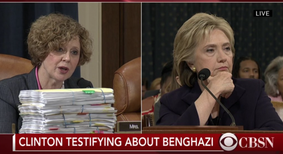 Rep. Susan Brooks (R-Ind.) literally confronted former Secretary of State Hillary Clinton with two piles of her emails during Thursday’s highly anticipated House Benghazi Committee hearing.