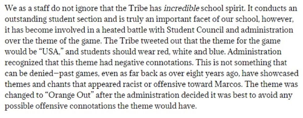 Students at Tempe's Corona del Sol High School reportedly were set to wear red, white and blue to the game at Marcos de Niza High School, also in Tempe, but an apparent editorial in the Corona del Sol student newspaper indicated that was forbidden.