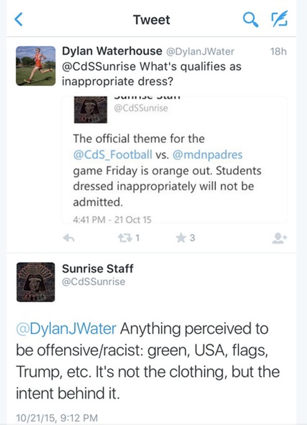 The origin of the tweet from the Sunrise Staff — stating that "Anything perceived to be offensive/racist: green, USA, flags, Trump, etc." was not allowed at the game — is also unclear. A report from KPNX-TV indicated the tweet was "a fake" and a "hoax" and that the district said it came from "a student account not authorized by the school."