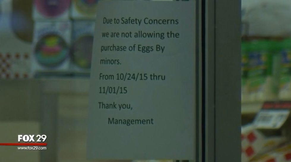 "Due to safety concerns we are not allowing the purchase of eggs by minors from 10/24/2015 thru 11/01/2015," a sign posted at the store stated.