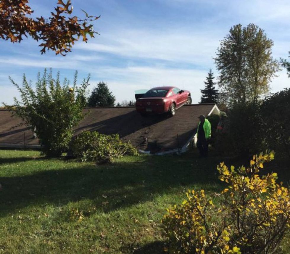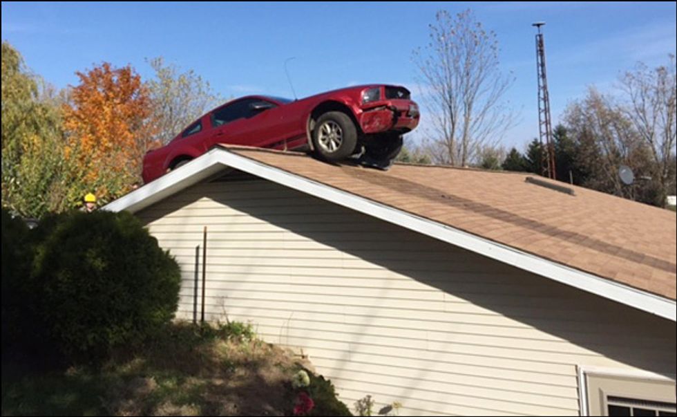 The 83-year-old needed to look up: A Ford Mustang was parked on the roof of her home after the driver had a medical problem Monday and lost control on Interstate 69 in Shiawassee County.