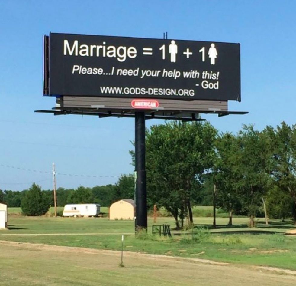 They unveiled their first billboard in Durant, Oklahoma, on July 24 — a 14-foot-by-48-foot placard with a message that reads, “Marriage =” and then an image of a man, a plus sign and a picture of a woman. A quote under those images is attributed to God and says, “Please…I need your help with this.”