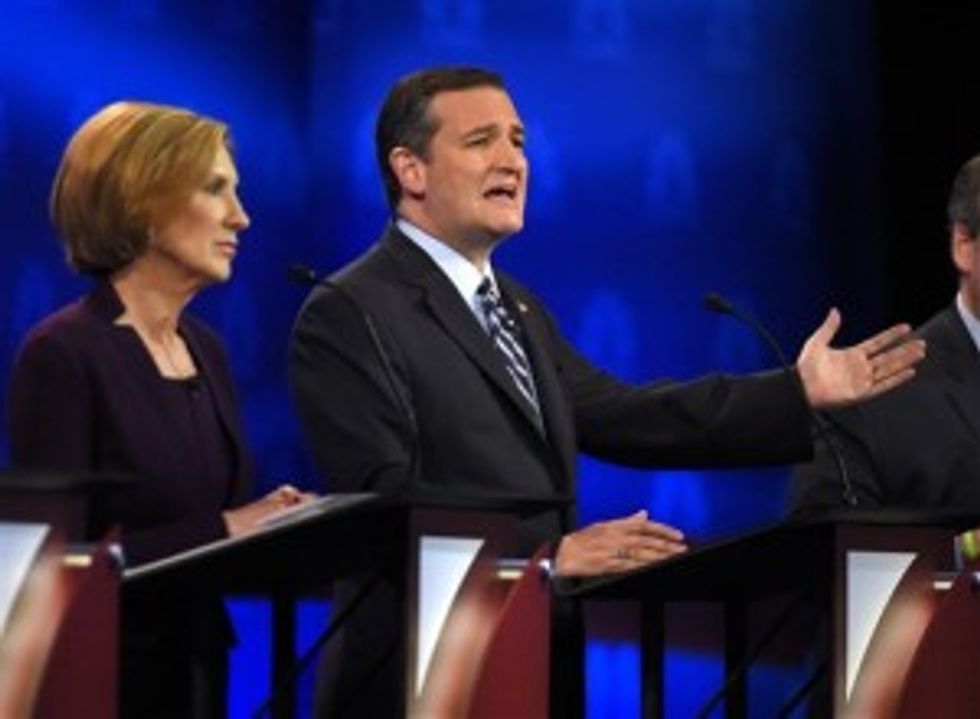 Ted Cruz, right, makes a point as Carly Fiorina looks on during the CNBC Republican presidential debate at the University of Colorado, Wednesday, Oct. 28, 2015, in Boulder, Colo. (AP Photo/Mark J. Terrill)