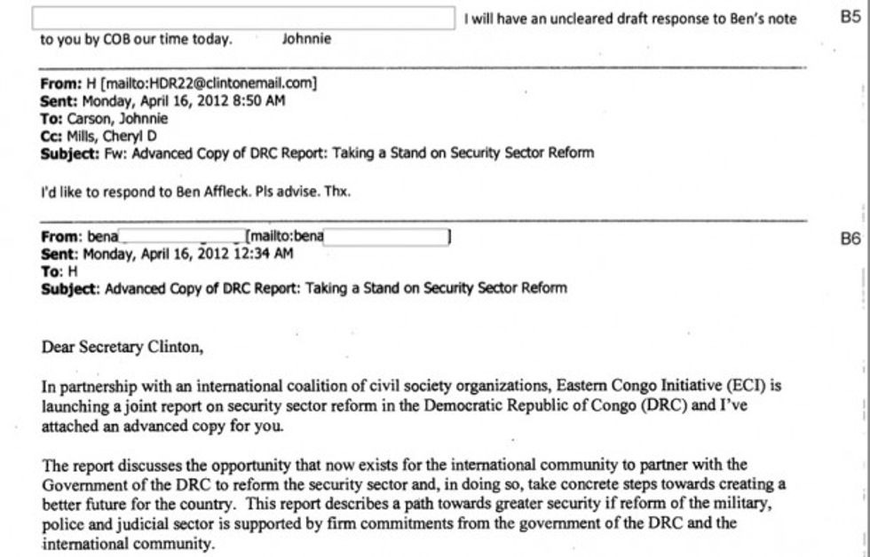 The "Argo" actor wrote to then-Secretary of State Clinton to provide her an advanced copy of a security report for the Democratic Republic of Congo. Affleck was writing on behalf of the Eastern Congo Initiative, an organization he is the director and founder of.