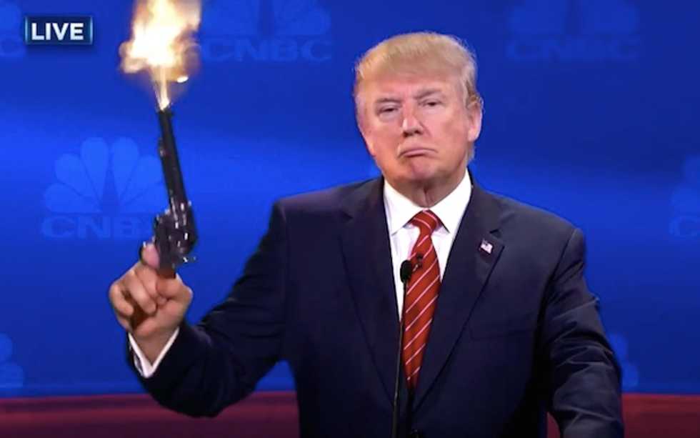 Kimmel used some creative editing to compare the debate to an episode of "The View," showing all of the candidates and moderators talking over each other until a pistol-packing Donald Trump fired a few rounds into the air to silence the crowd.